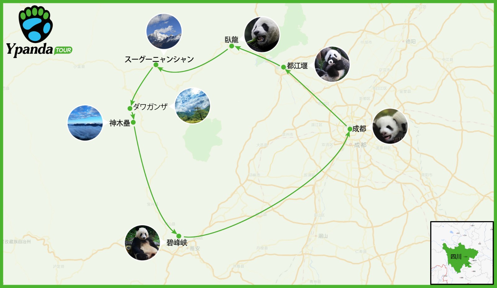 ルート: 成都‐都江堰‐臥龍‐四姑娘山‐神木壘‐达瓦更扎‐碧峰峡‐成都